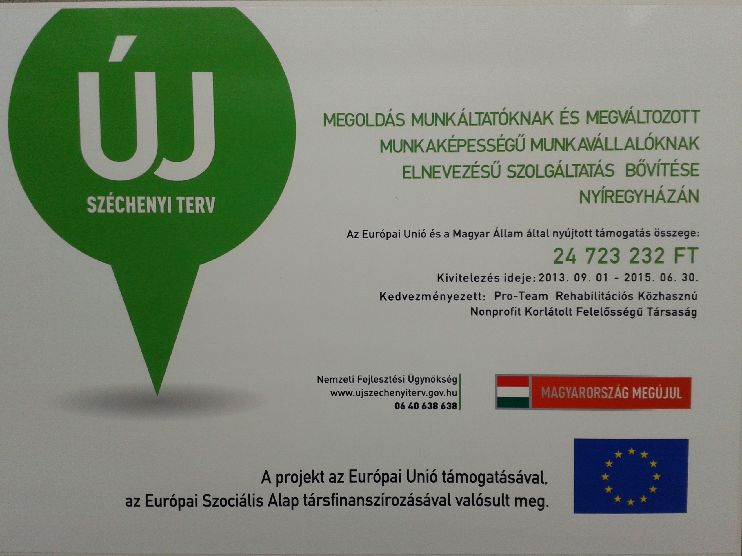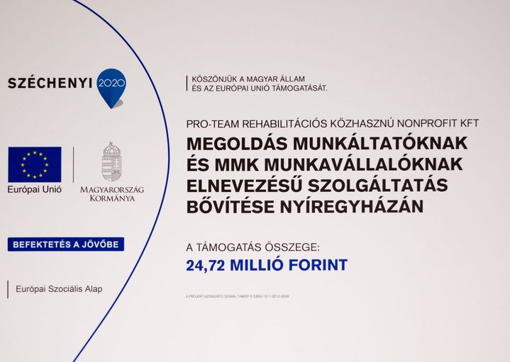 A „Pro-Team” Nonprofit Kft 24,72 millió forint vissza nem térítendő európai uniós támogatás segítségével a „Leghátrányosabb helyzetű csoportok munkaerő-piaci esélyeinek növelése érdekében motiváló képzések és kapcsolódó szolgáltatások támogatása munkaerő-piaci szolgáltatóknál” című pályázati felhívás alapján, „Megoldás Munkáltatóknak és Megváltozott Munkaképességű Munkavállalóknak elnevezésű szolgáltatás bővítése Nyíregyházán” elnevezésű pályázatot valósított meg, mely szolgáltatásaival a megváltozott munkaképességű munkavállalók nyílt munkaerő-piacon történő tartós elhelyezkedését segítette.